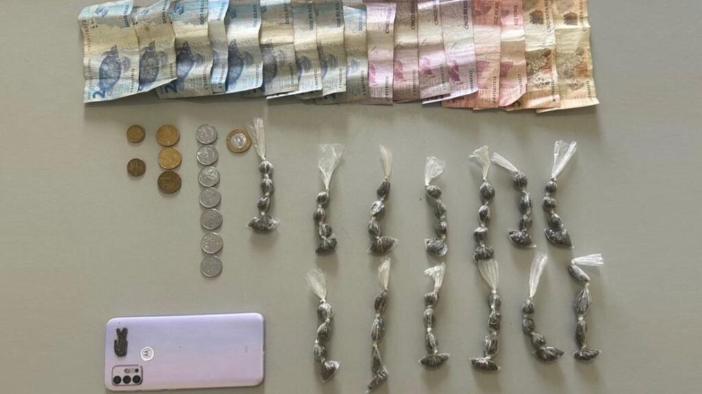 Durante a revista pessoal, os agentes encontraram oito buchas de uma substância análoga à maconha no bolso traseiro do suspeito. Ao verificar a sacola descartada, a equipe localizou uma quantidade ainda maior do material ilícito, reforçando indícios de envolvimento com o tráfico de drogas.